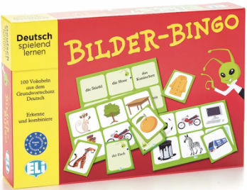 Bilder-Bingo besteht aus einem Stoß von 100 Karten mit Abbildungen auf der einen Seite und dem entsprechenden Wort auf der anderen, 36 Bingo-Tafeln mit je sechs Abbildungen auf einer Seite und den entsprechenden Wörtern auf der anderen.