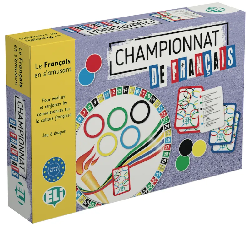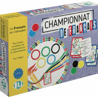 Championnat de Français est un jeu de table qui s’articule sur un parcours par étapes marqué par les 5 couleurs des anneaux olympiques. Chaque couleur correspond à un thème contenu dans les cartes présentant des questions à choix multiples: rouge pour la culture, vert pour la géographie, noir pour l’histoire, jaune pour une vie saine, bleu pour la nature.