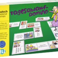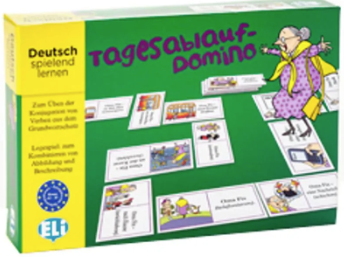 Das Tagesablauf-Domino führt spielerisch und unterhaltsam die alltäglichen Handlungen der sympathischen Oma Fix ein, vom Aufwachen bis zum Schlafengehen. Es geht dabei darum, Bilder und Texte richtig zu kombinieren und die Verben korrekt zu konjugieren.
